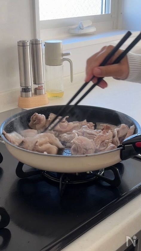 (3) フライパンにごま油(炒め用)を熱し、豚バラ薄切り肉を広げて中火で炒める。