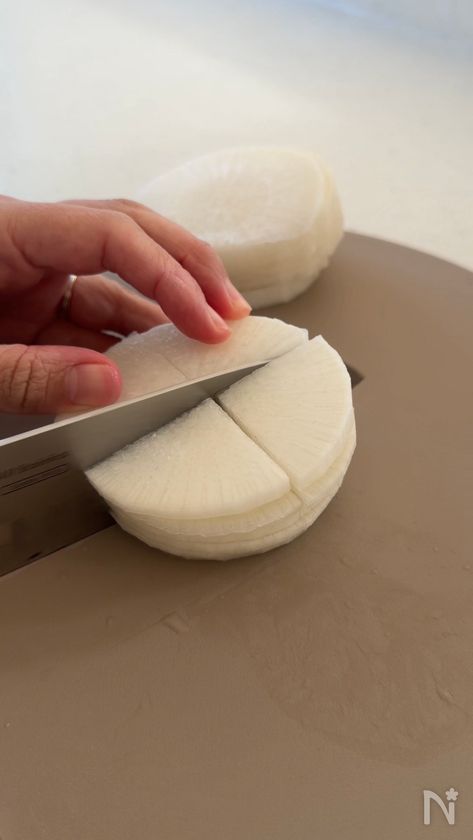 (1) 大根は3〜4mmの薄いちょう切りにする。