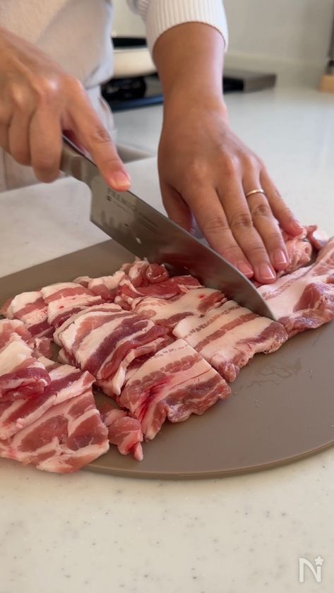 (2) 豚バラ薄切り肉は食べやすい長さに切り、塩、コショウをふって軽く下味をつける。