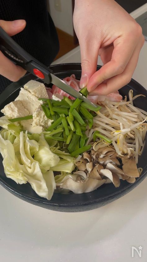 ・ニラをハサミで1~2cm幅に切る。その他の具材(キャベツ、舞茸、木綿豆腐)を食べやすい大きさに手でちぎる。