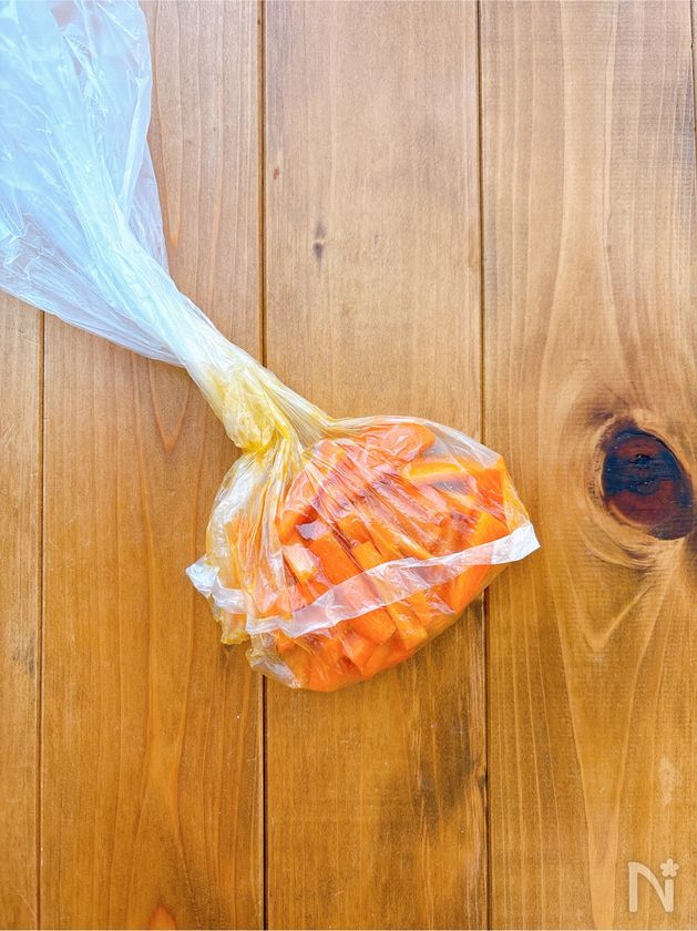 (1) にんじんはスティック状に切り、袋ににんじんと【A】を入れて揉む。