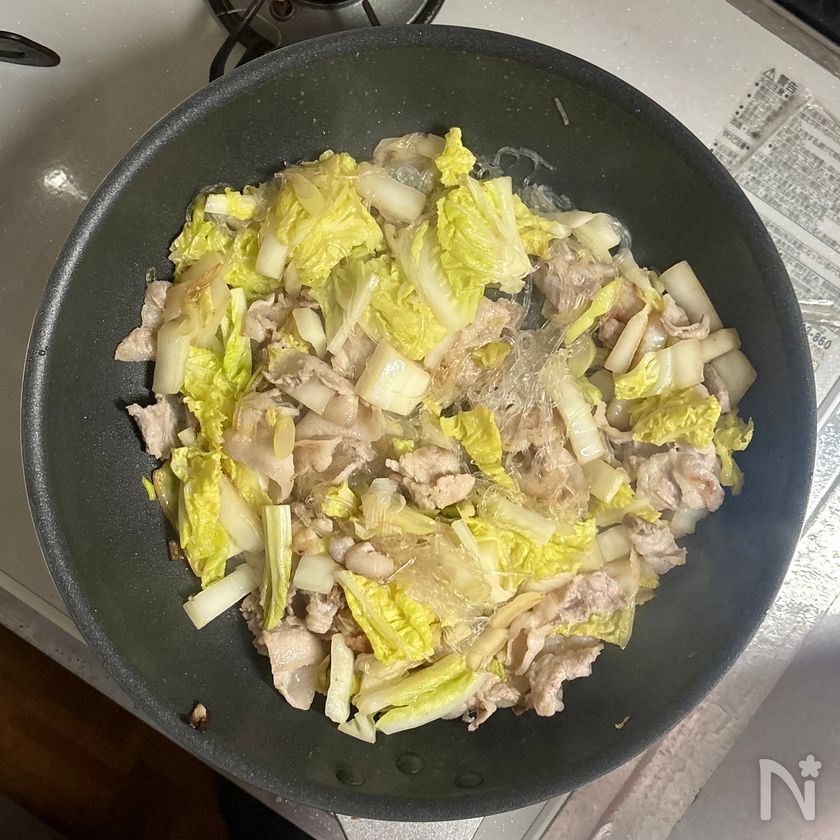 春雨をほぐしながら、汁気がほとんどなくなるまで30〜40秒ほど炒め合わせる。