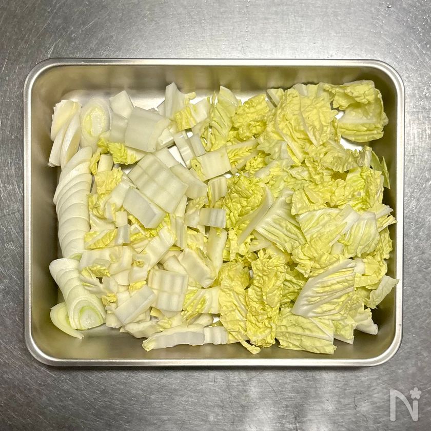 白菜は葉元と葉先に切り分け、葉元は繊維を断つように1cm幅に切り、葉先は3cm四方に切る。