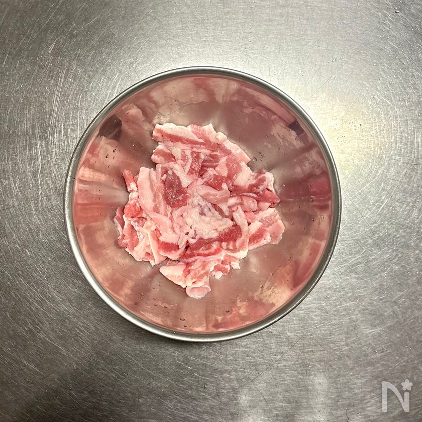 (2) 豚バラ肉は3cm幅に切り、【A】をもみ込む。