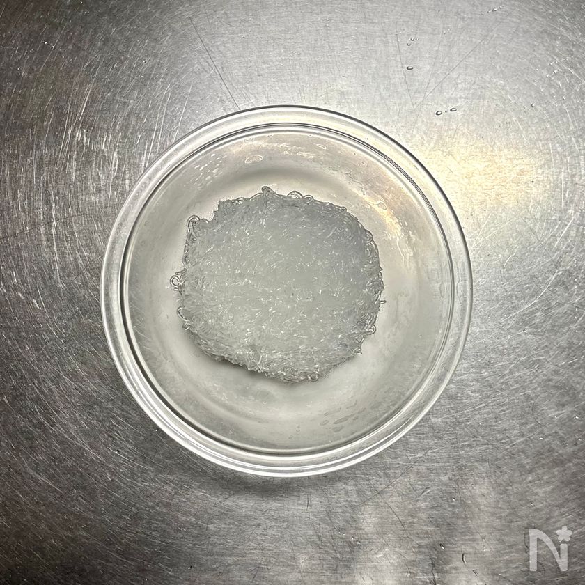 (3) 鍋に湯を沸かし、緑豆春雨を袋の表示時間通りにゆでる。