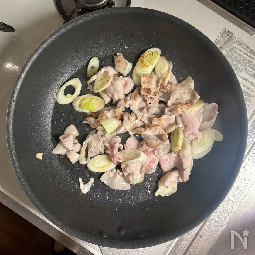 (5) フライパンにサラダ油を熱し、長ねぎ、豚肉を入れ、肉の色が八分通り変わるまで中火で炒める。