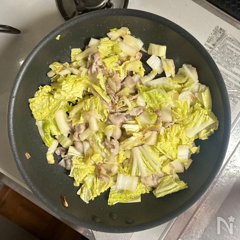 白菜の葉先を加えて強めの中火にし、さらに1分ほど炒める。