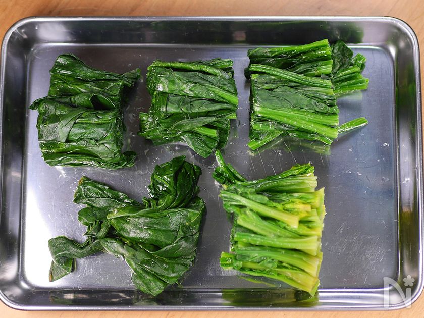 (1) ○鍋にたっぷりの湯を沸かし、塩(大さじ1、分量外)を加え、ほうれん草(水洗いして砂を落とす)をさっと湯がく。