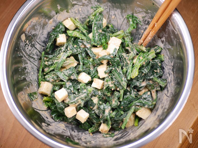 (3) ボウルにほうれん草、プロセスチーズ、胡麻だれを入れ、和える。