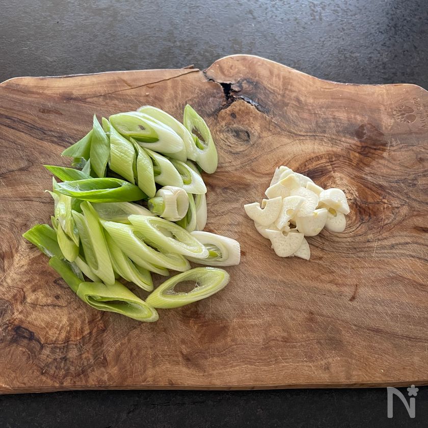 (1) 長ネギは斜め切り、にんにくは薄切りにする。