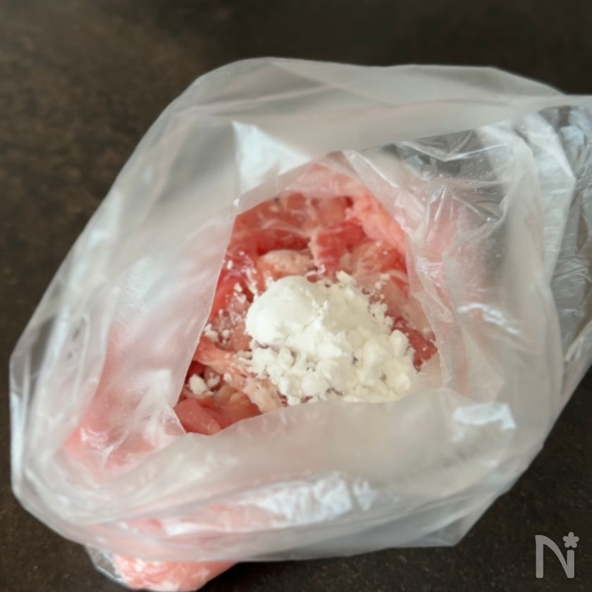 (2) 豚こま肉に塩と酒を揉み込み、片栗粉を馴染ませる。