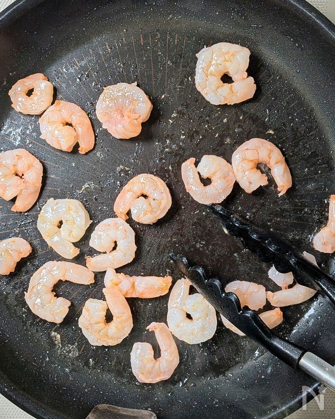 ・えびは加熱しすぎると縮むので、両面を焼いたら一旦取り出し、最後にフライパンに戻し入れましょう。