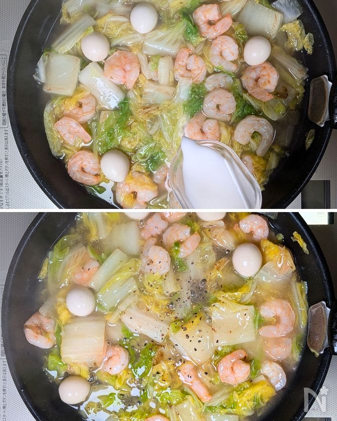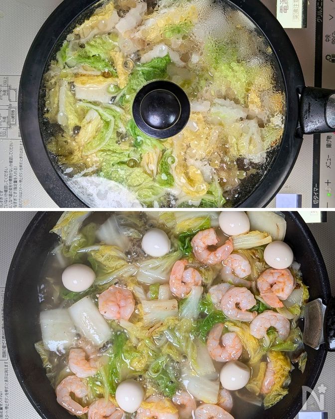 えびとうずらゆで卵を入れ1分煮る。