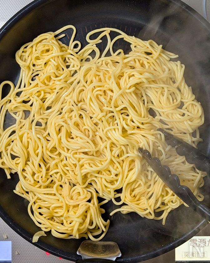 (3) フライパンにサラダ油をひき、温めた焼きそば麺を炒め、皿に盛り付ける。