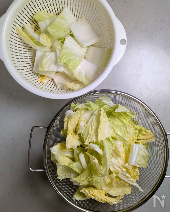 白菜はざく切りにして、白い部分と緑の葉の部分に分ける。