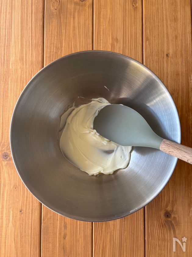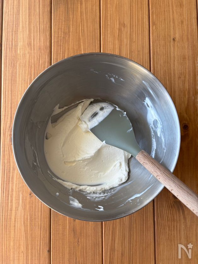 (2) クリームチーズに砂糖を加え、滑らかになるまでよく混ぜる。