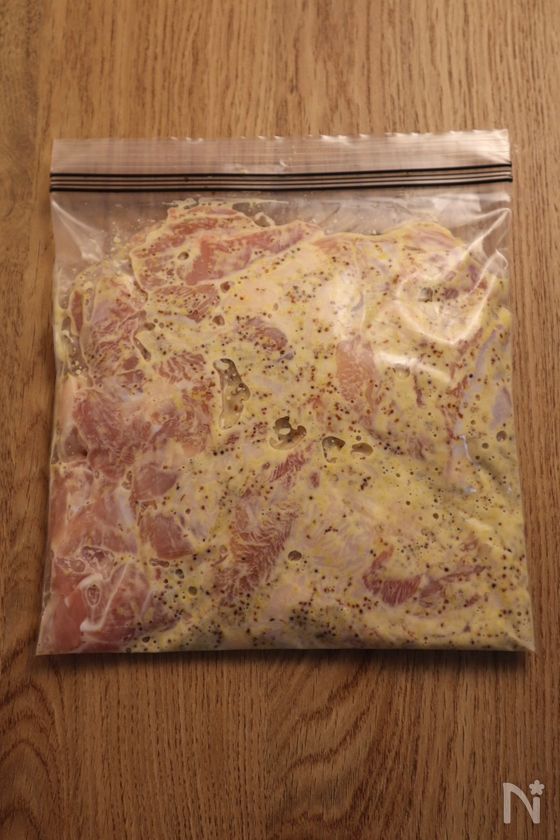 (1) 保存袋にカットした鶏モモ肉と【A】をすべて入れ、よく揉み込む。袋の空気を抜いてしっかり口を閉じ、冷蔵庫で1時間ほどおく。