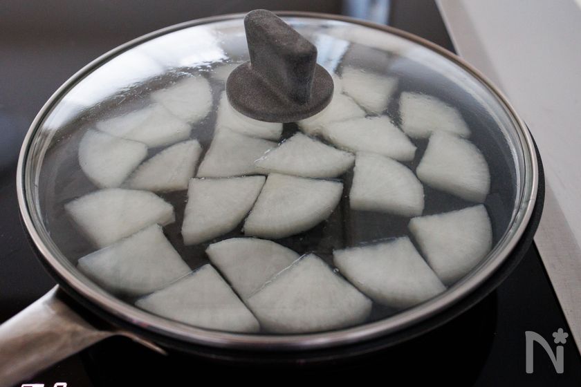 (2) フライパンに大根とかぶるくらいの水を入れ加熱し、沸いてきたら蓋をして徐々に火を弱め、大根がやわらかくなるまで12分ほど茹でて水気を切る。