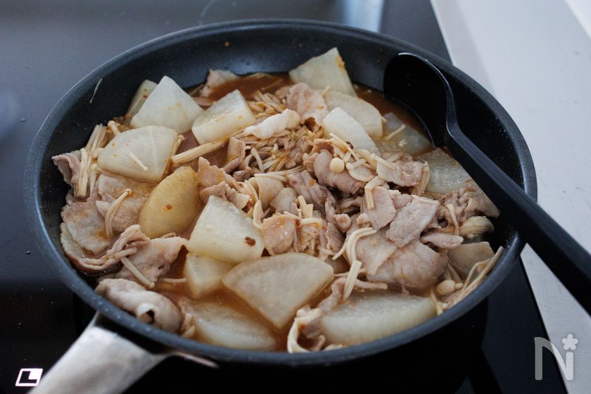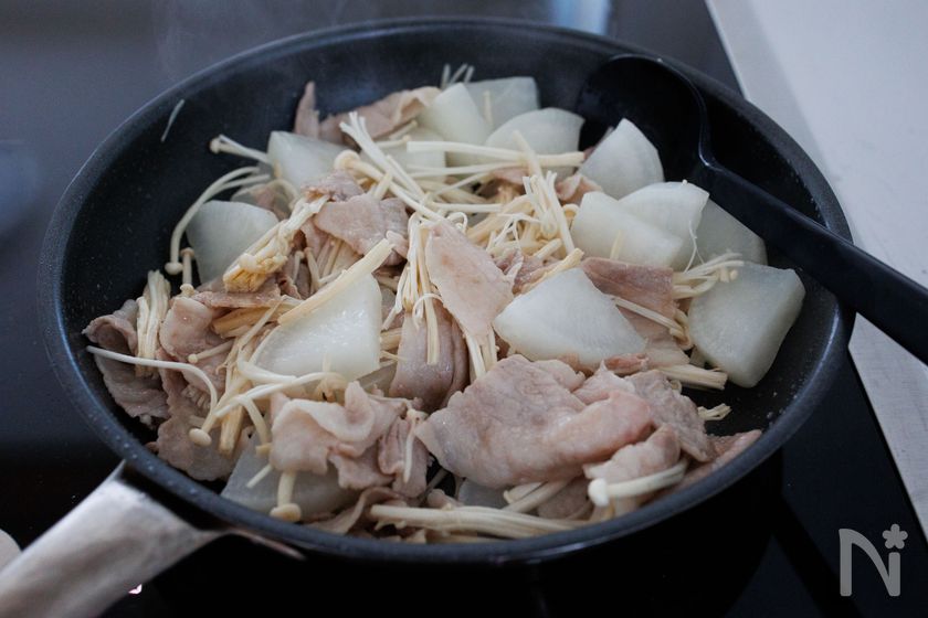 (3) 2のフライパンを中火で熱し、豚肉を炒めて火が通ってきたら、大根とえのきを加えて軽く炒める。