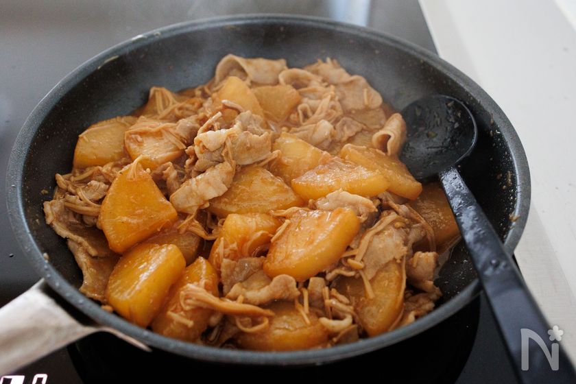 (煮汁をよく絡めながら炒め煮することで、大根や豚肉にしっかりと味が染みます😊)