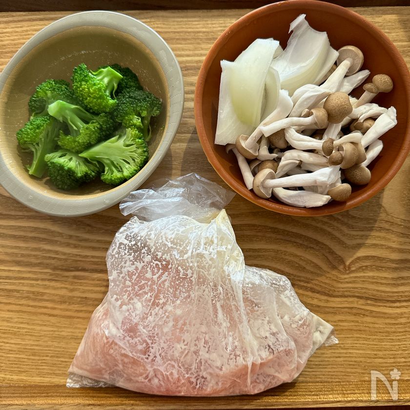 (1) ブロッコリーは小房に分けて水洗い。耐熱容器に入れてラップをしレンジ(600w)で1分半加熱して水けを拭き取る。玉ねぎは皮をむき芯を取り除いてくし切りに。しめじは石づきを切り落としてほぐしておく。鶏むね肉はひと口大に切り【A】をもみ込み、薄力粉をまぶす。