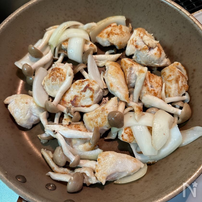 (2) フライパンにサラダ油をひく。鶏肉の両面を中火でこんがり焼き色をつけたら、しめじと玉ねぎを加えて、しんなりする程度まで炒める。