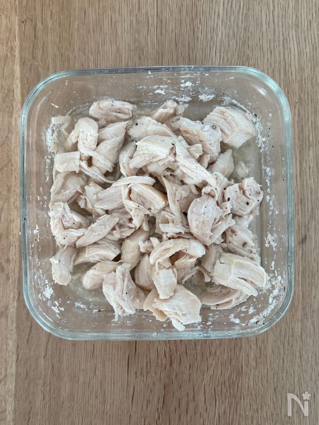 (2) ささみは、【A】を揉みこみ、耐熱容器に入れ、ラップをして、電子レンジ(600w)で、3分30秒~4分加熱し、そのまま冷ます。粗熱がとれたら、さいて残っているだし汁に3分程浸す。