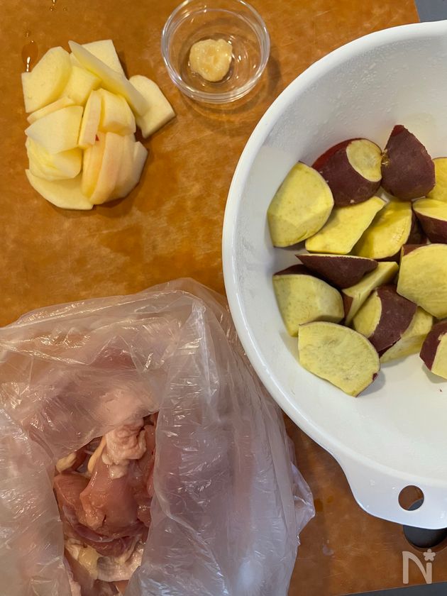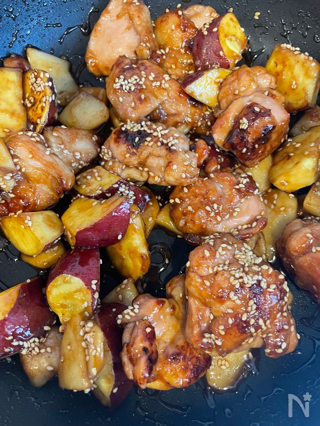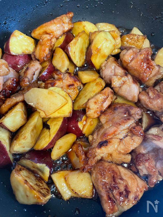 【鶏肉とさつまいものりんごガーリック甘辛炒め】