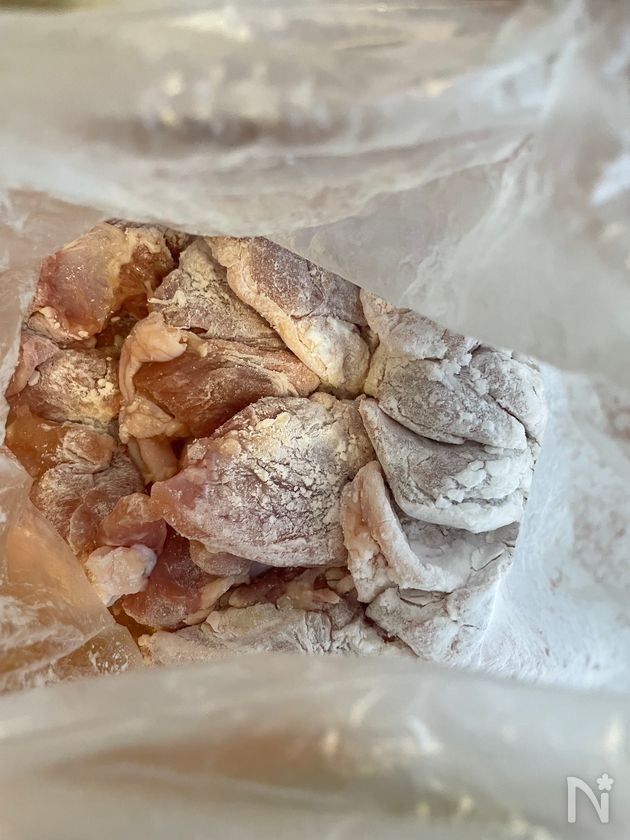 (下準備) ・鶏もも肉をひと口大に切り、液体塩こうじをもみこみ、30分常温でつけておく。