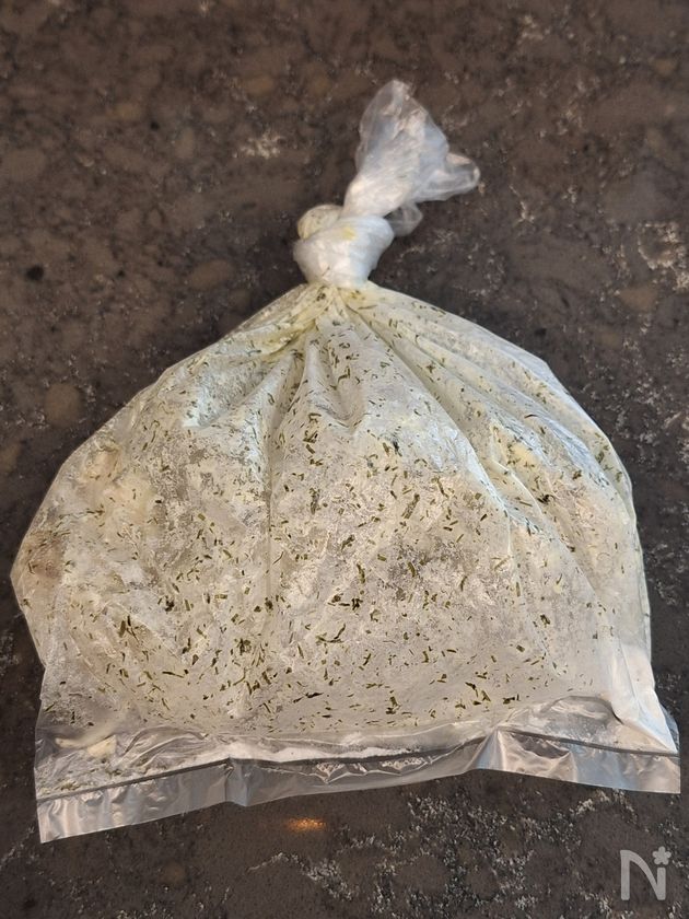 (2) ポリ袋にまいたけと【A】を入れてやさしくもみこむ。