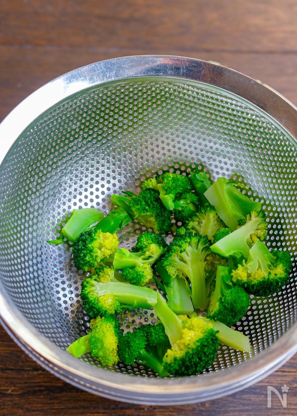 (1) ブロッコリーは小さめのひと口大に切って洗い、水分がついた状態で耐熱容器に入れ、ラップをかけて電子レンジ(600W)で2分加熱する。ざるにあげて塩を少々まぶして粗熱をとる。
