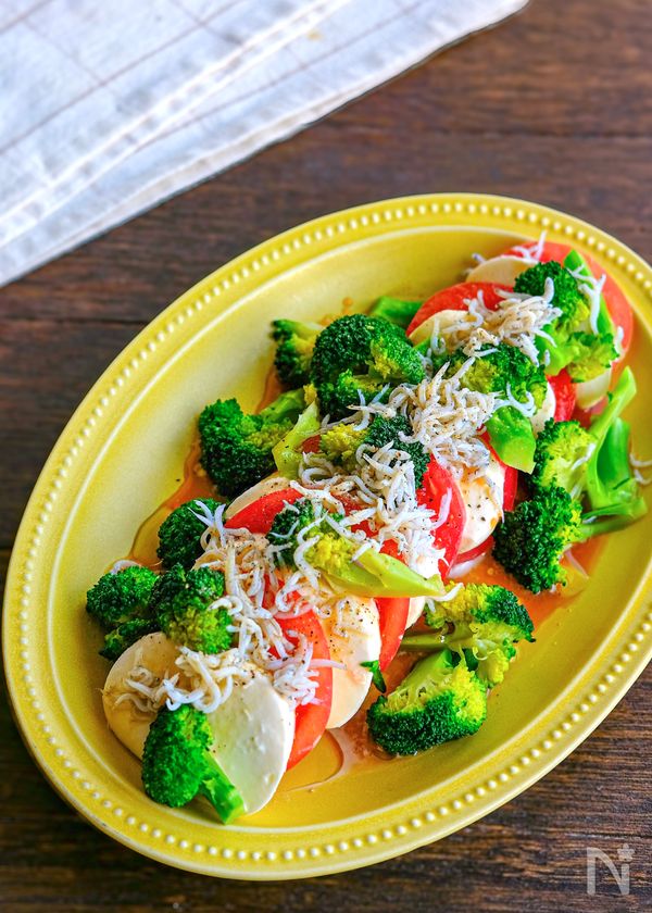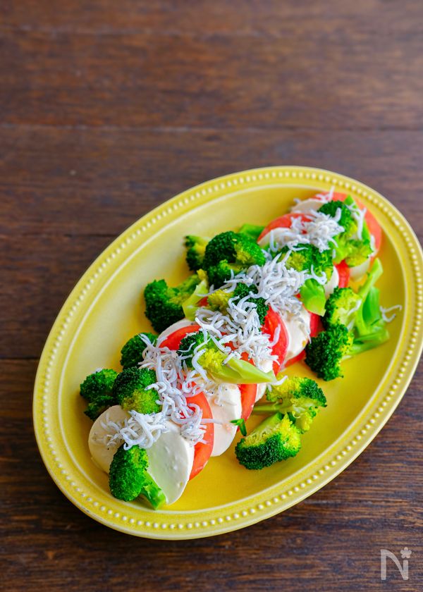 器にモッツァレラチーズとトマトを交互に並べる。ブロッコリーをちらし、釜揚げしらすをのせる。