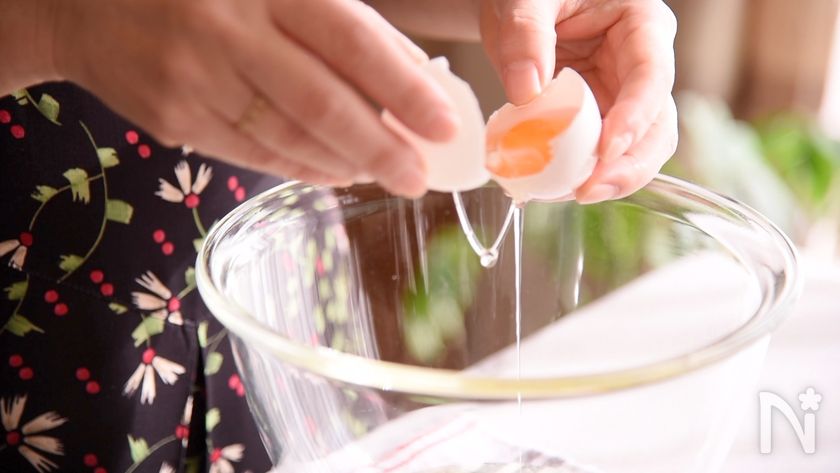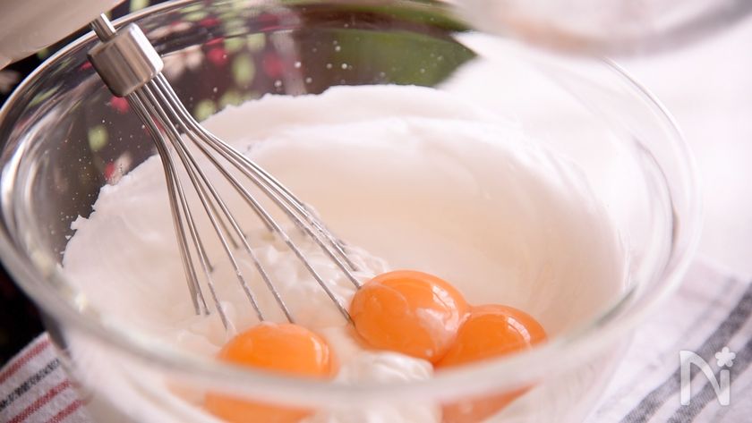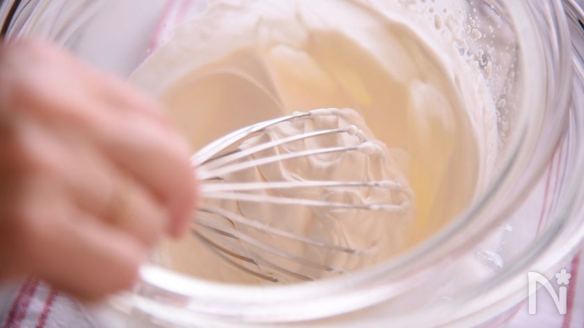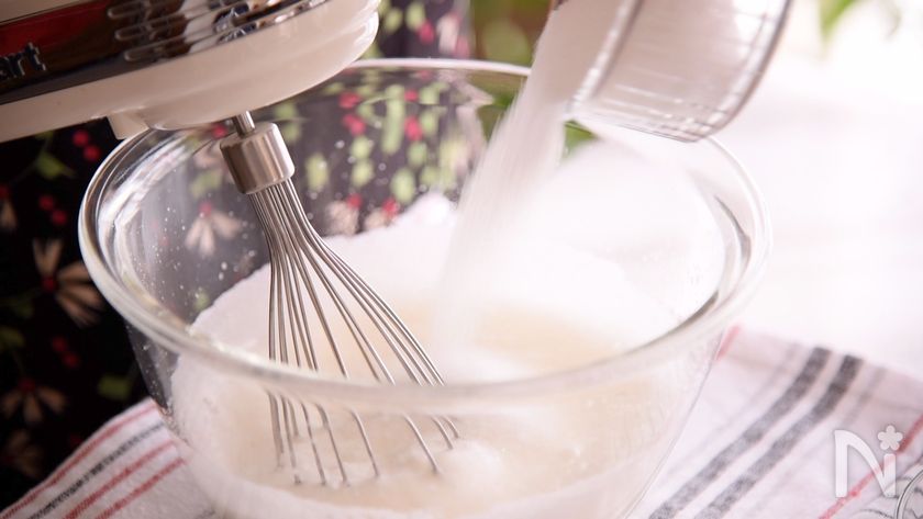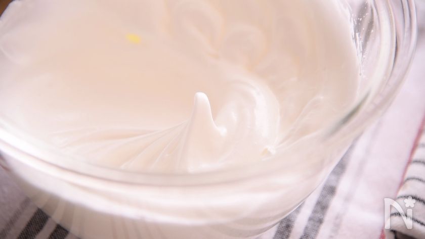 油分や水分などがついていない綺麗なボウルに卵白を入れます。少しでも卵黄が入ってしまうとメレンゲが立たないので注意します。(もし卵黄が入ってしまった場合は全卵にグラニュー糖を入れ、ボウルごと湯煎にかけて温めながら泡立てて下さい)