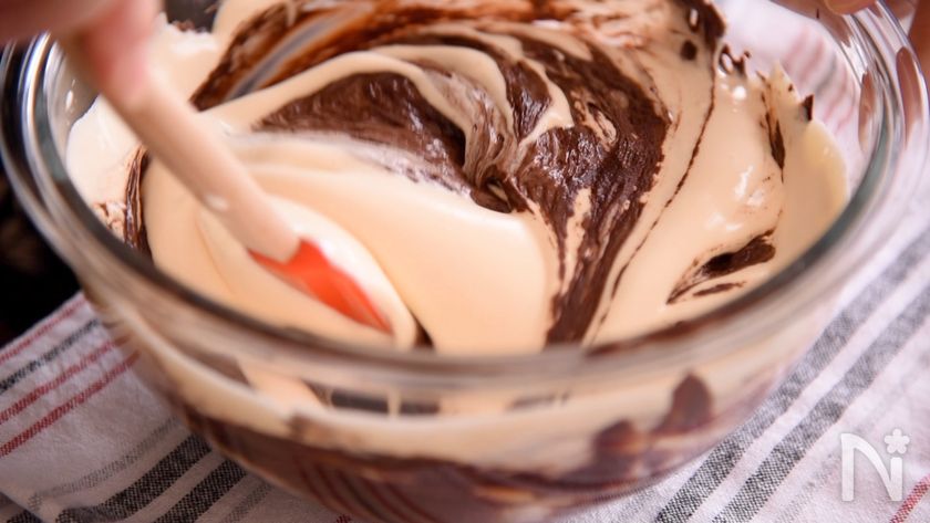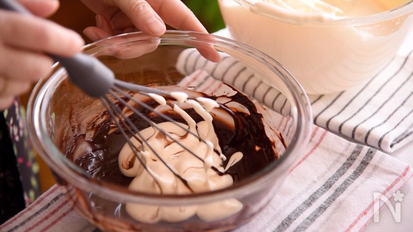 (11) バターチョコの生地に卵生地を2〜3回に分けて入れて混ぜます。