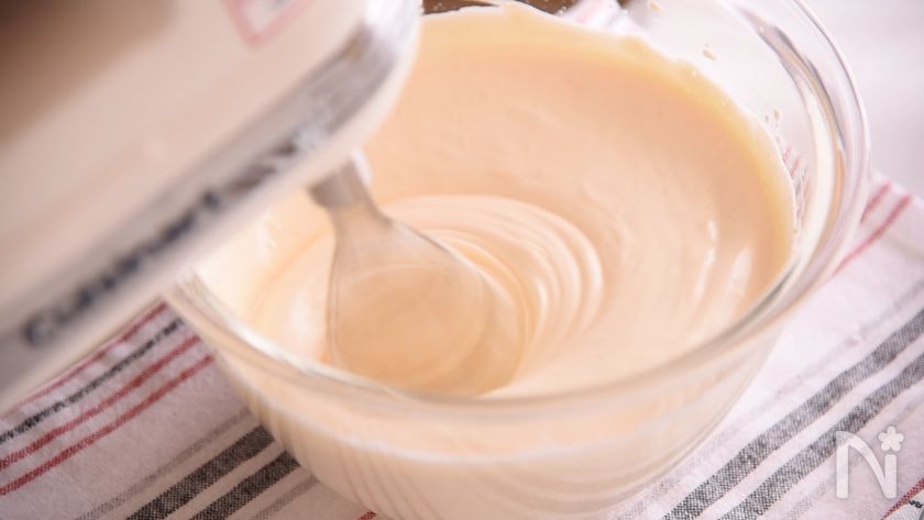 (9) マヨネーズのような色になるまでしっかりとハンドミキサーの高速で泡立てます。