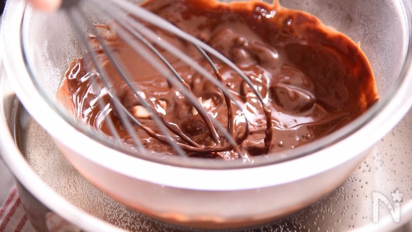 (10) 先に湯煎しておいたバターチョコの生地に泡立てた卵をひとすくい入れて混ぜます。よく馴染むまでしっかり混ぜます
