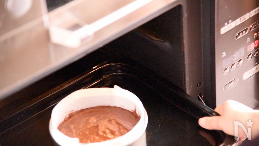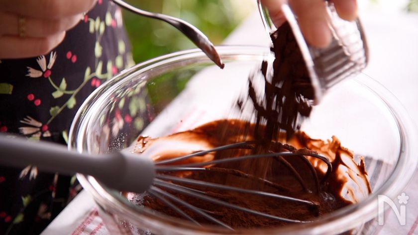 (4) カカオパウダーを入れて混ぜる。50℃くらいに温度を上げる。湯煎のまま置いておく。