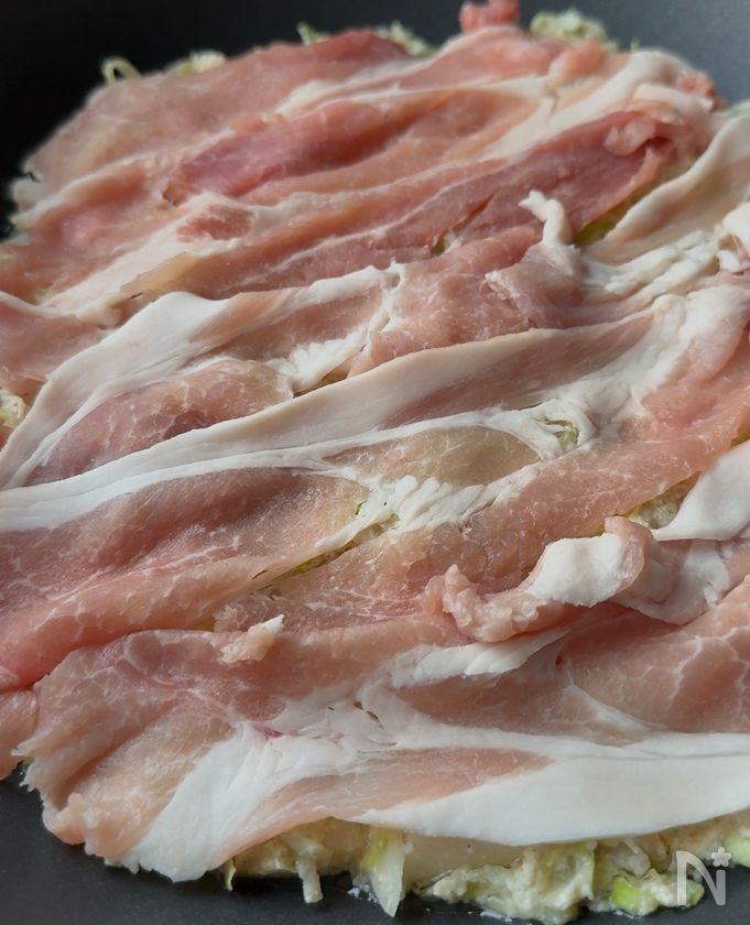 (5) フライパンにサラダ油を半量(大さじ1)入れ、4の半量を広げる。上から豚こま切れ肉半量をのせたら、中火で焼く。