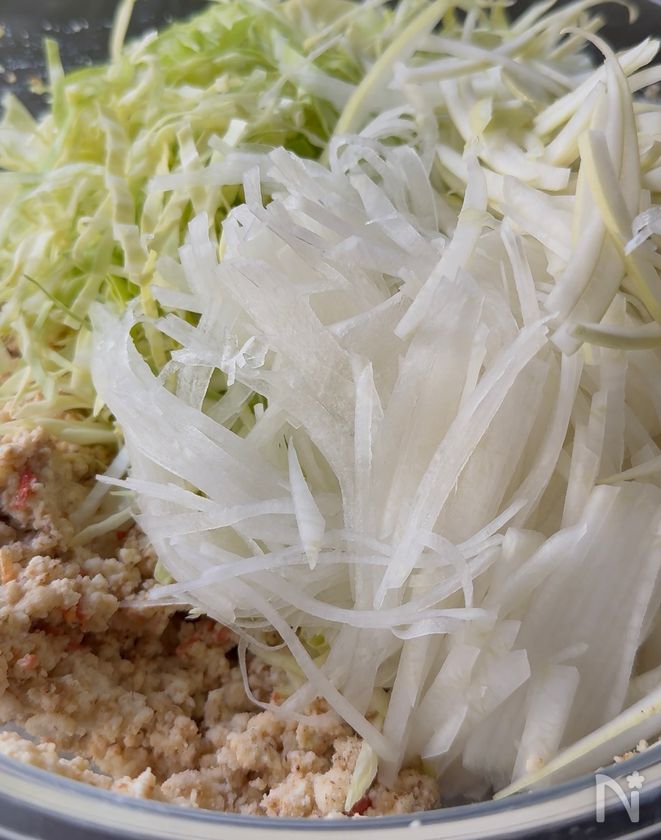 キャベツと皮つきのままの大根は千切りにする。