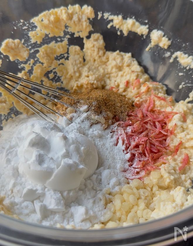(2) 1に卵を加えしっかりと混ぜ、【A】を加え再度混ぜる。