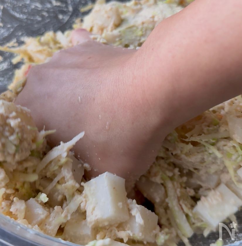 ・キャベツと大根を加えたら、手でしっかりともみながら混ぜてください。粉っぽさがありますが、大根から水分が出るので、しっかり混ぜるとひとまとまりになります。ただし、スプーンなどではひとまとまりにならないことがあります。