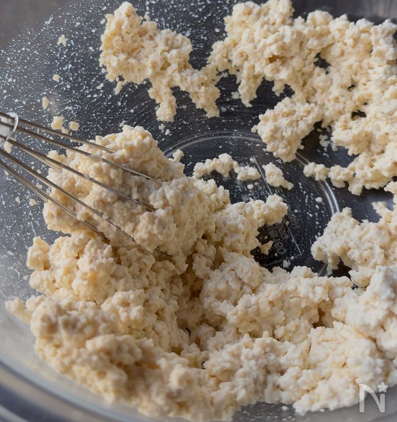 (1) ボウルに電子レンジで加熱したおかめ豆腐 もめんミニ3を入れ、泡立て器などでクリーム状にする。