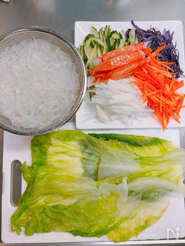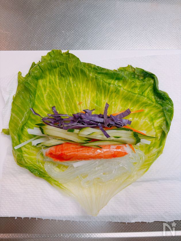 (2) レタスの葉に野菜・春雨・かに風味かまぼこをのせ、手前からくるっとひと巻き。