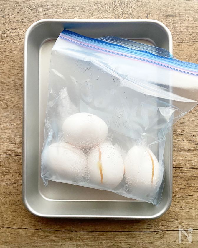 (1) たまごをジプロックまたはポリ袋に入れ、一日冷凍する。
