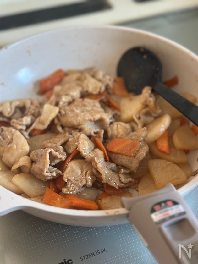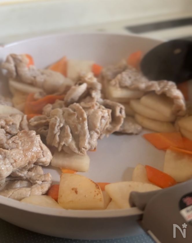 大根とにんじんをレンジで加熱している間に豚こまを炒めておくと時短に繋がります。