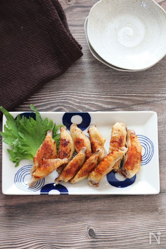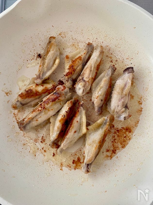 (1) こめ油を熱したフライパンで手羽中を皮目から中火で3分ほど焼き、焼き色がついたらひっくり返して酒をまわしかけ、蓋をして2分ほど蒸し焼きにする。蓋をとって更に1〜2分、皮がカリッとするまで焼く