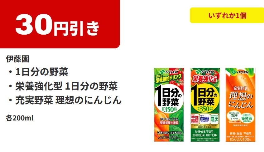 12月4日から17日までの期間、セブン-イレブンアプリを提示して、対象の伊藤園の野菜飲料を1本購入するごとに、次回使える30円引きクーポンがもらえます。