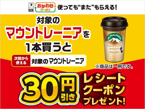 12月4日から10日までの期間、対象のマウントレーニアを1本購入するごとに、次回使える30円引きクーポンがもらえます。