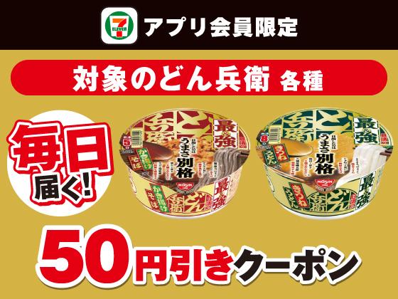 12月4日から17日までの期間、セブン-イレブンのアプリ会員限定で、対象のどん兵衛に使える50円引きクーポンが毎日届きます。