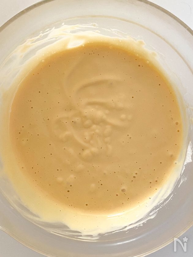 (2) ボウルに卵、卵黄、砂糖を入れて泡立て器ですり混ぜてから、米粉、プレーンヨーグルトを加えて、よく混ぜ合わせる。